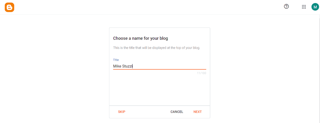 Click on the "Create Your Blog" button to begin the process. First, you have to choose a name for your blog: