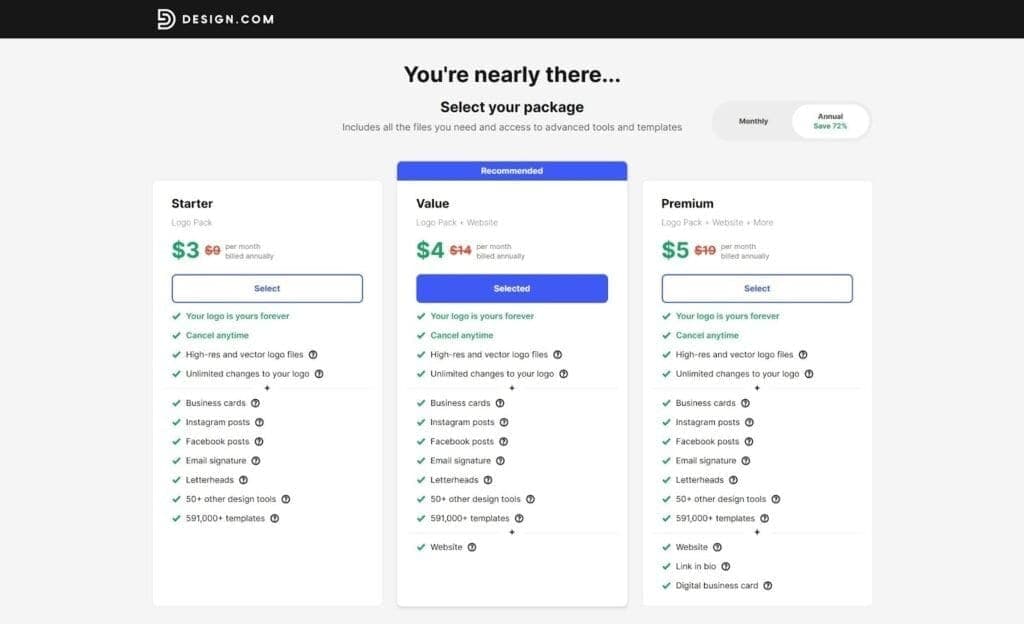 Design.com offers a free plan where you can select, edit, and download free logos at zero cost. It’s perfect if you want something quick and simple.