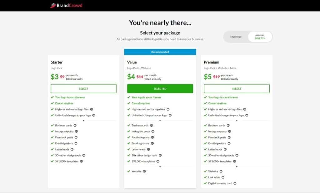 BrandCrowd offers a free plan where you can select, edit, and download free logos at zero cost. But its paid plans are also affordable: