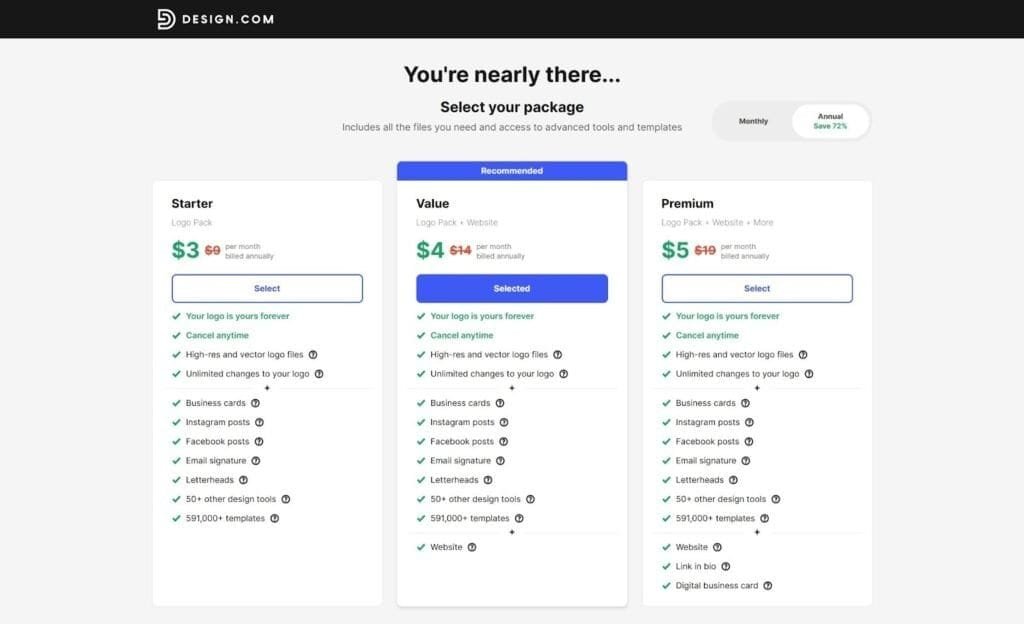 Here’s what you get with Design.com’s paid plans: