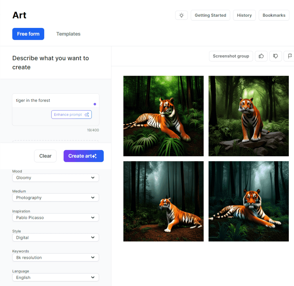 Jasper enables you to use the art feature in two ways: Free Form and Templates. Free Form simply means describing your picture and creating it from scratch.